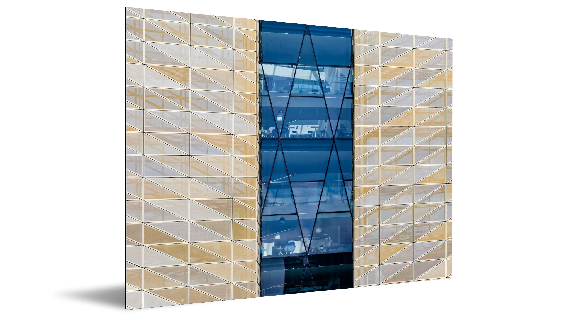 La force de cette photographie réside dans l'opposition franche des teintes. D'un côté, le métal doré des panneaux perforés apporte une chaleur texturée ; de l'autre, le bleu profond et transparent des surfaces vitrées offre une respiration froide et lisse. Ce contraste chromatique transforme la façade en une composition abstraite où la lumière vient souligner chaque arrête et chaque reflet, créant une profondeur presque hypnotique.