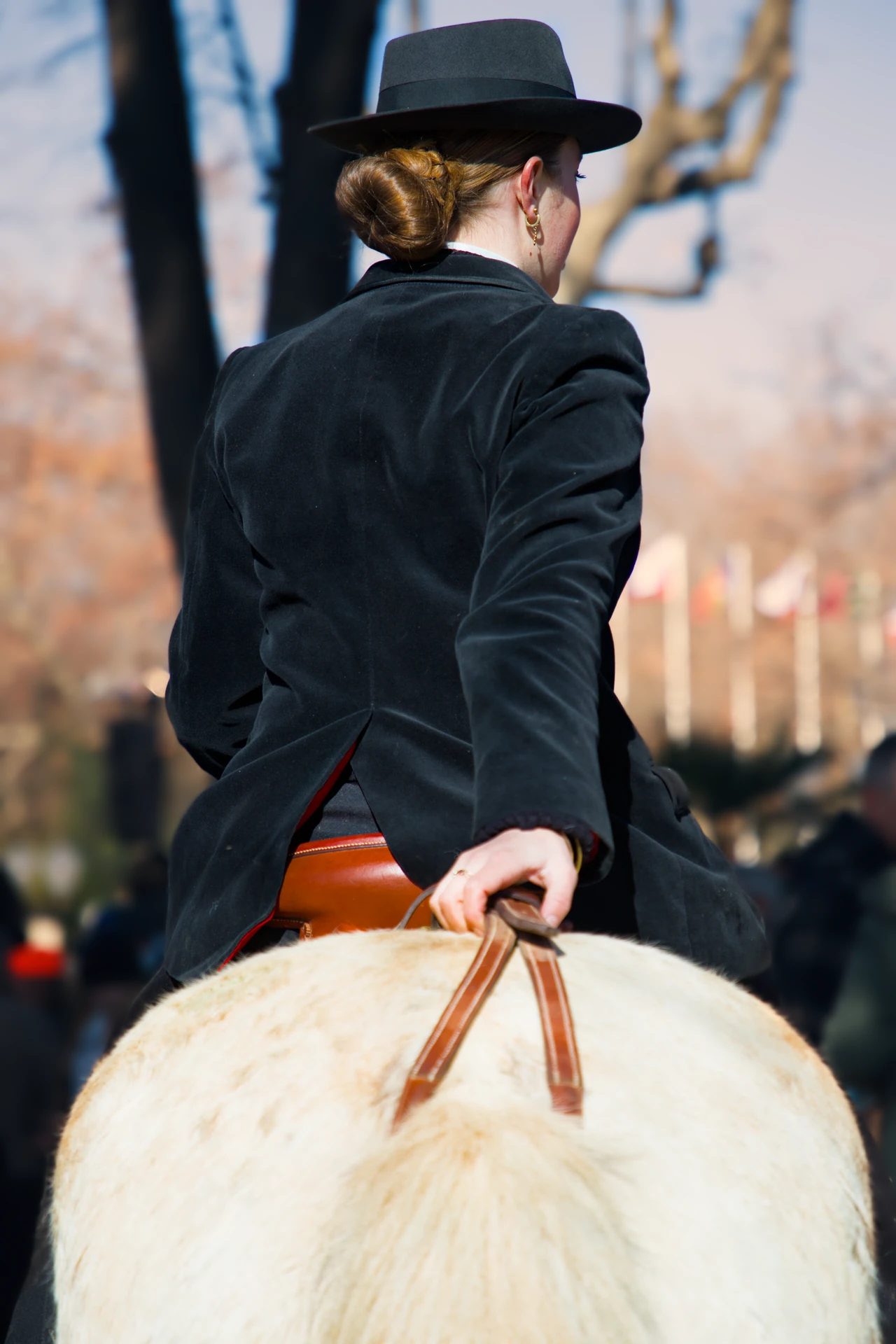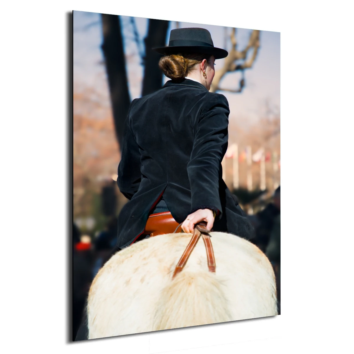 L'image capture un détail essentiel : la main de la cavalière, symbole de contrôle et de complicité avec sa monture. Le titre « La Maîtrise du Geste » fait écho à cette assurance tranquille nécessaire pour perpétuer les traditions équestres. Le costume — la veste courte en velours noir et le chapeau emblématique — souligne une identité forte qui traverse les époques sans rien perdre de sa superbe.