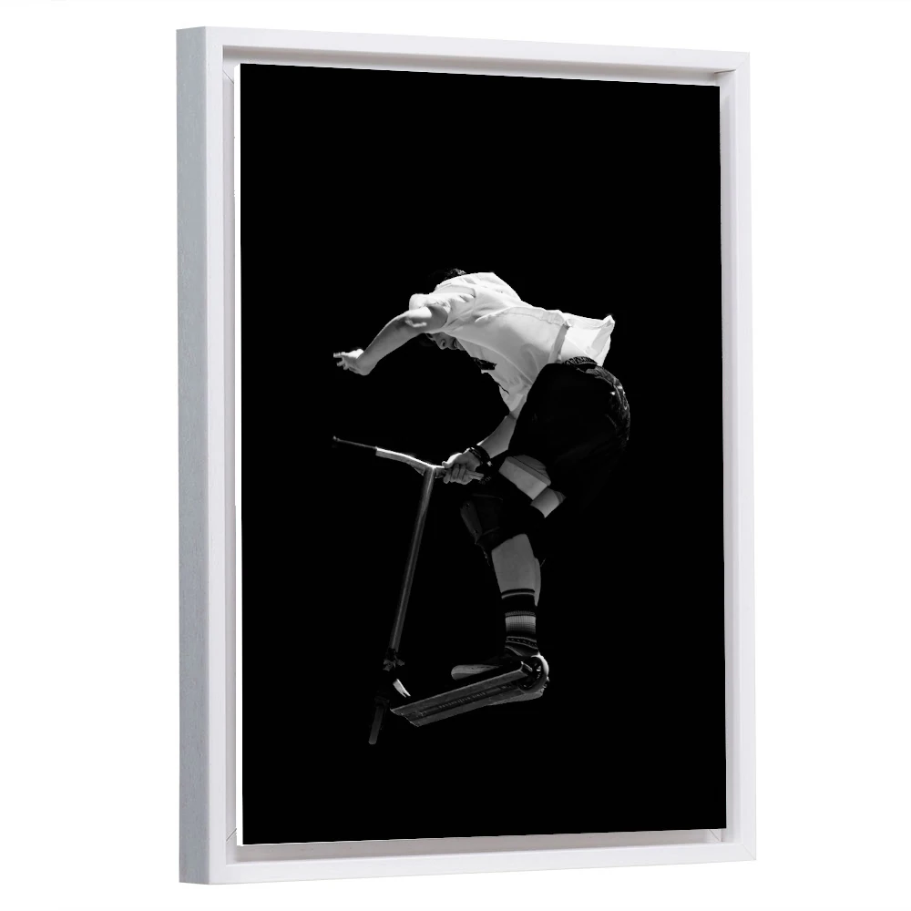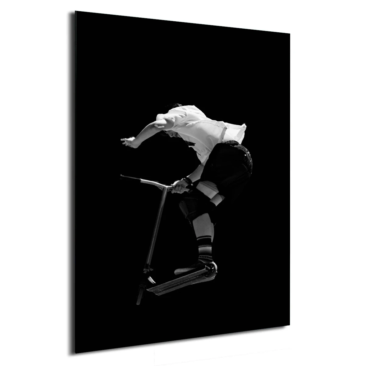 Issue de ma série dédiée aux sports extrêmes, cette photographie d'art se concentre sur la complexité d'une figure de trottinette freestyle. Le titre « Torque » fait référence à la force nécessaire pour exécuter ce mouvement. Ici, le noir et blanc profond élimine toute distraction visuelle pour ne laisser place qu'à la dynamique pure du corps en torsion et à la structure métallique de la trottinette.