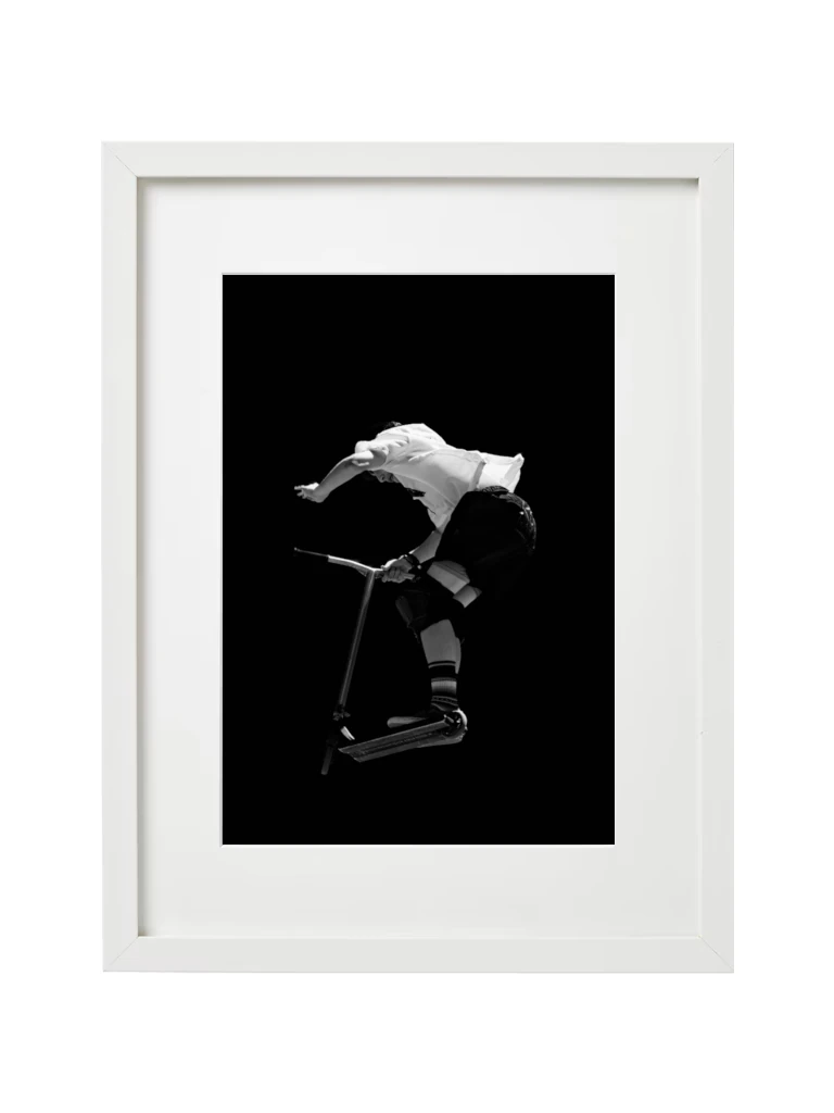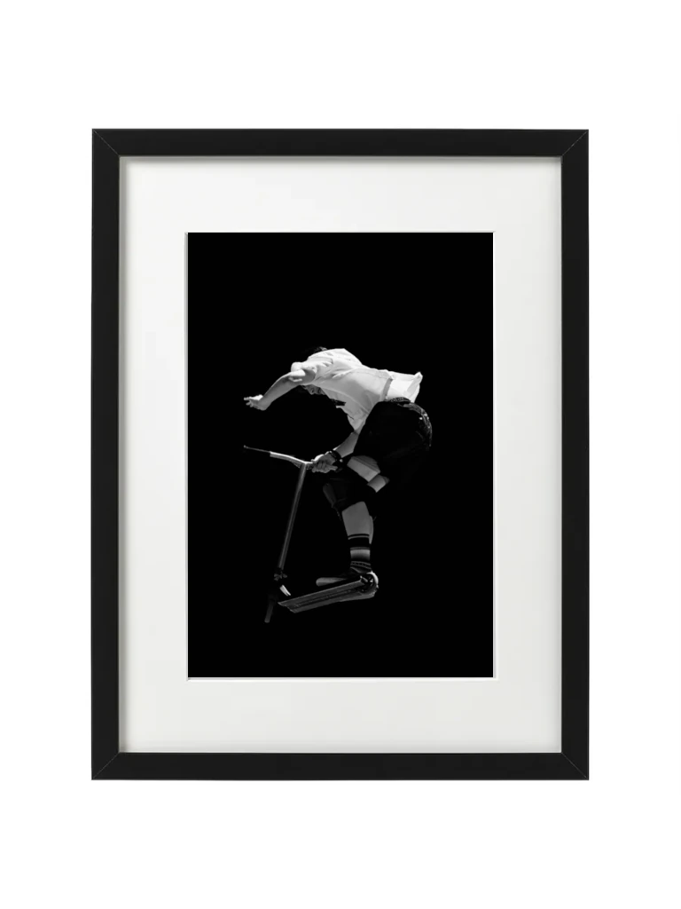 Tirage Fine Art en édition limitée. Cette œuvre captivante en noir et blanc immortalise une figure de trottinette freestyle lors du FISE Montpellier. Entre puissance brute et équilibre précaire, elle révèle la beauté sculpturale du sport extrême. Disponible en plusieurs supports haut de gamme.