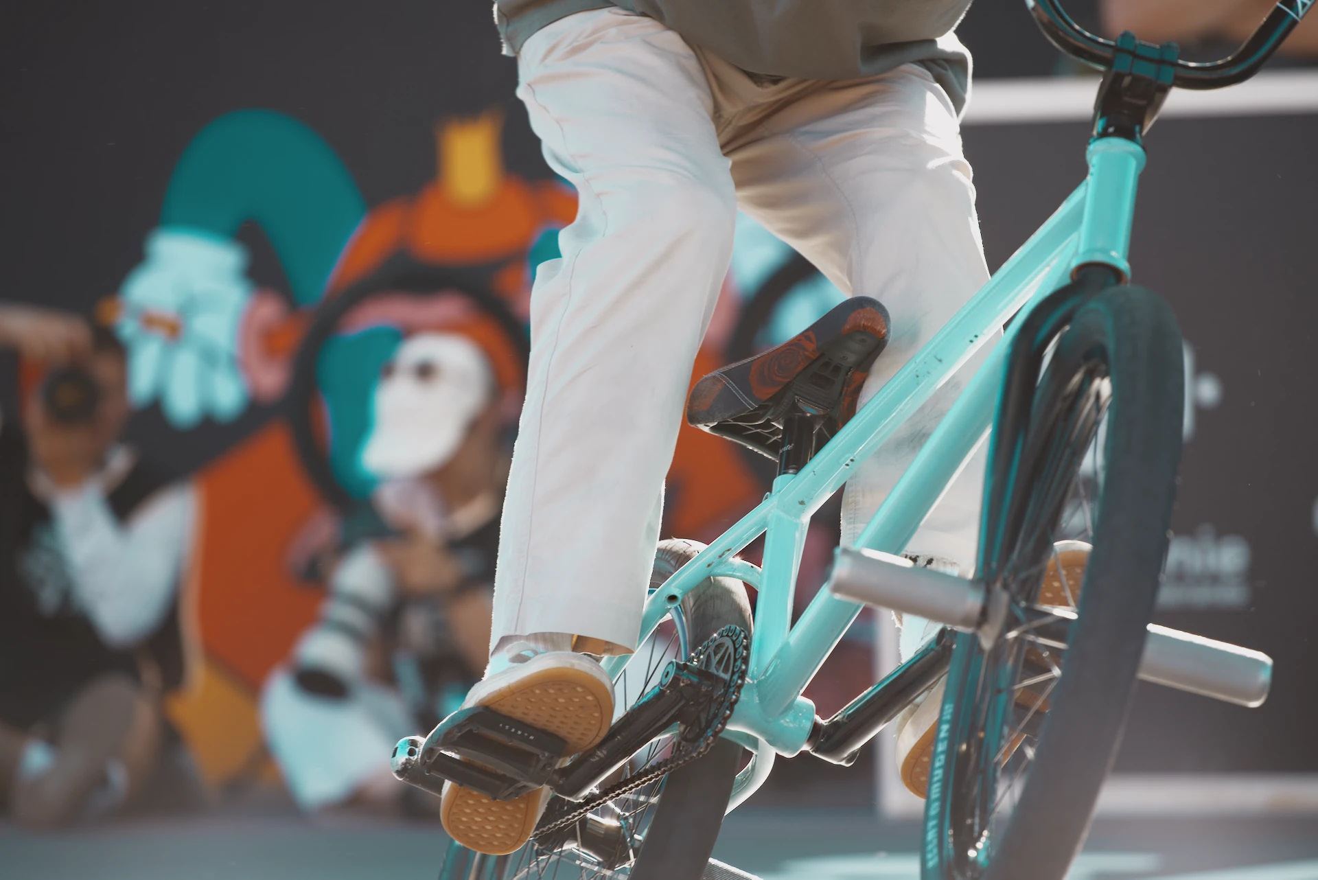 L'instant décisif : Saisie lors de la première manche de la Coupe du Monde UCI au FISE Montpellier 2025, cette image est née d'une rencontre visuelle immédiate. L'harmonie chromatique entre les teintes vives de l'arrière-plan (fresque de street art) et le bleu cyan du cadre a dicté le déclenchement. En figeant cette fraction de seconde, la photographie révèle la fluidité d'une discipline exigeante, exécutée à même le sol plat, tel un ballet moderne en milieu citadin.